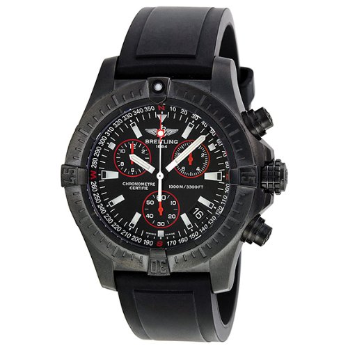 #Black PVD stainless steel case with a black Pro-Diver II rubber strap. Uni-directional rotating black PVD bezel. Black dial with silver-tone hands and stick hour markers. Minute markers. Compass scale around the outer rim. Dial Type: Analog. Luminescent hands and markers. Date display appears between the 4 and 5 o'clock positions. Chronograph - three sub-dials displaying: 60 second, 12 hour and 1/10th of a second. Quartz movement. Scratch resistant sapphire crystal. Screw locked crown. Solid case back. Case diameter: 45.5 mm. Case thickness: 18 mm. Round case shape. Band width: 22 mm. Tang clasp. Water resistant at 1000 meters / 3300 feet. Functions: chronograph, date, hour, minute, second. Luxury watch style. Breitling Aeromarine Avenger Seawolf Chronograph Automatic Black Dial Mens Watch M7339010-BA03.