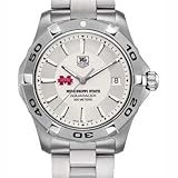 | ✚✚✚ Mississippi State Men's TAG Heuer Steel Aquaracer Mississippi State Men's TAG Heuer Steel Aquaracer watch M logo; "Mississippi State" is written underneath.Brushed steel bracelet with a double security clasp. Case stamped from a block solid steel (39mm diameter). Unidirectional rotating bezel . Luminescent hands and indexes for optimum readability. Screw-in crown and caseback for water resistance to 300 meters. Swiss made Quartz movement. Scratch-resistant sapphire crystal. Unique TAG Heuer presentation box. TAG Heuer international two-year warranty.