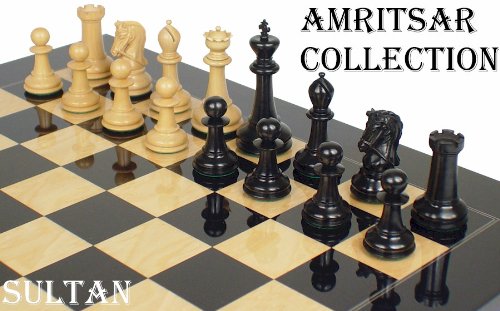 Sultan Staunton Chess Set in Ebony & Boxwood - 4.5" King?Designed and manufactured by our partner Amritsar Ivory works, the Sultan is a stunning piece of contemporary Staunton design. This chess set has a 4.5" tall king and with a unique and elegant knight that features ornate detail and a bridle. The fine detail carved into the knight is exquisite with special attention paid to the eyes, ears, nose, and mouth. The replication of the carvers work from knight to knight is remarkable. The ebony is pure black and polished to a beatiful glossy shine. The boxwood is beautifully grained and with the ideal medium amber color.